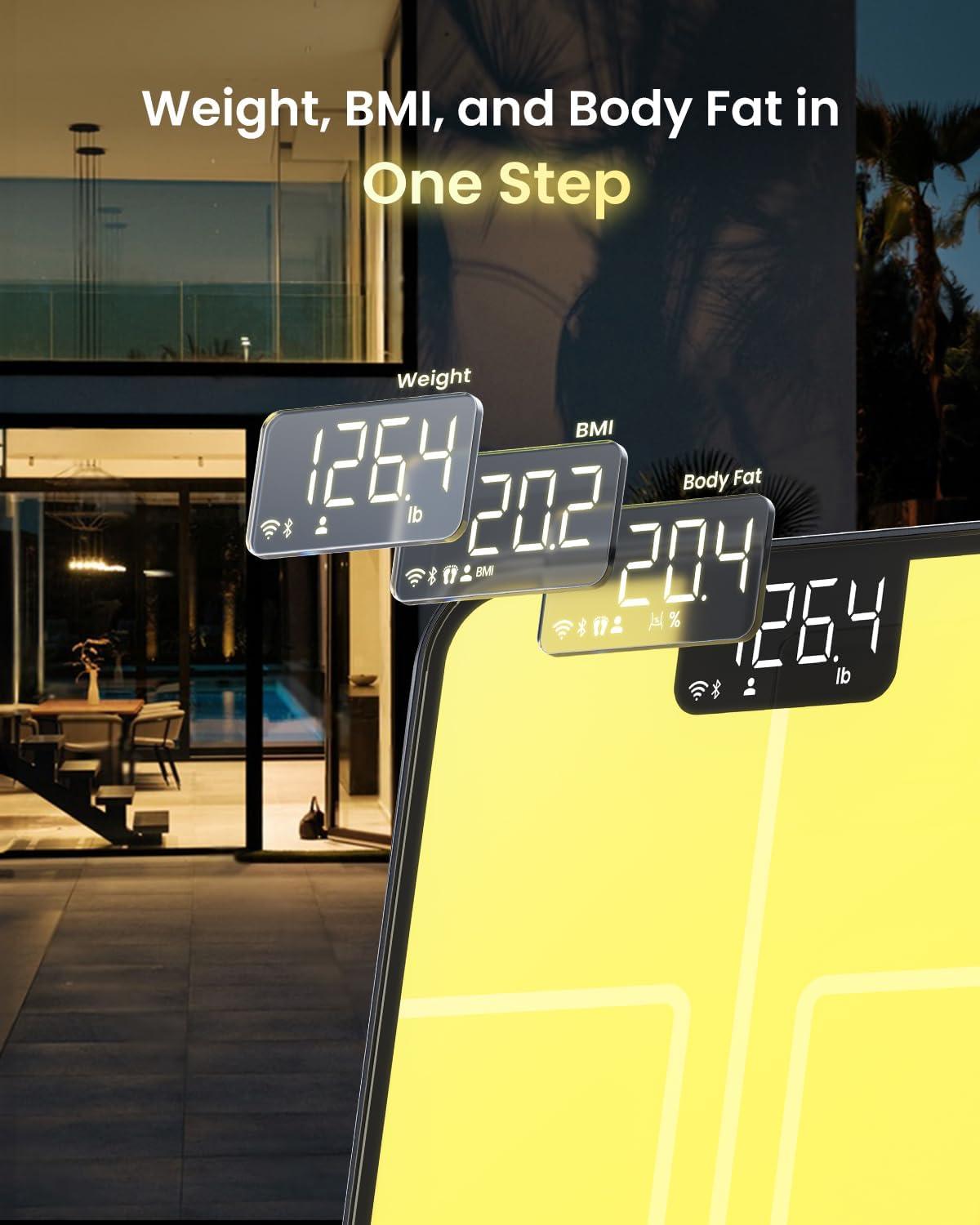 Body Fat Scale – This weight scale offers more than just measurements. The scale for body weight enhances your environment with customizable lighting that creates a relaxing atmosphere for studying, working, or sleeping, and provides gentle illumination for nighttime bathroom visits. This body weight scale features dual connectivity options—Bluetooth and Wi-Fi. Precision ITO coating and accurate pressure sensors deliver reliable measurements with a precision of 0.2 lbs/50 grams