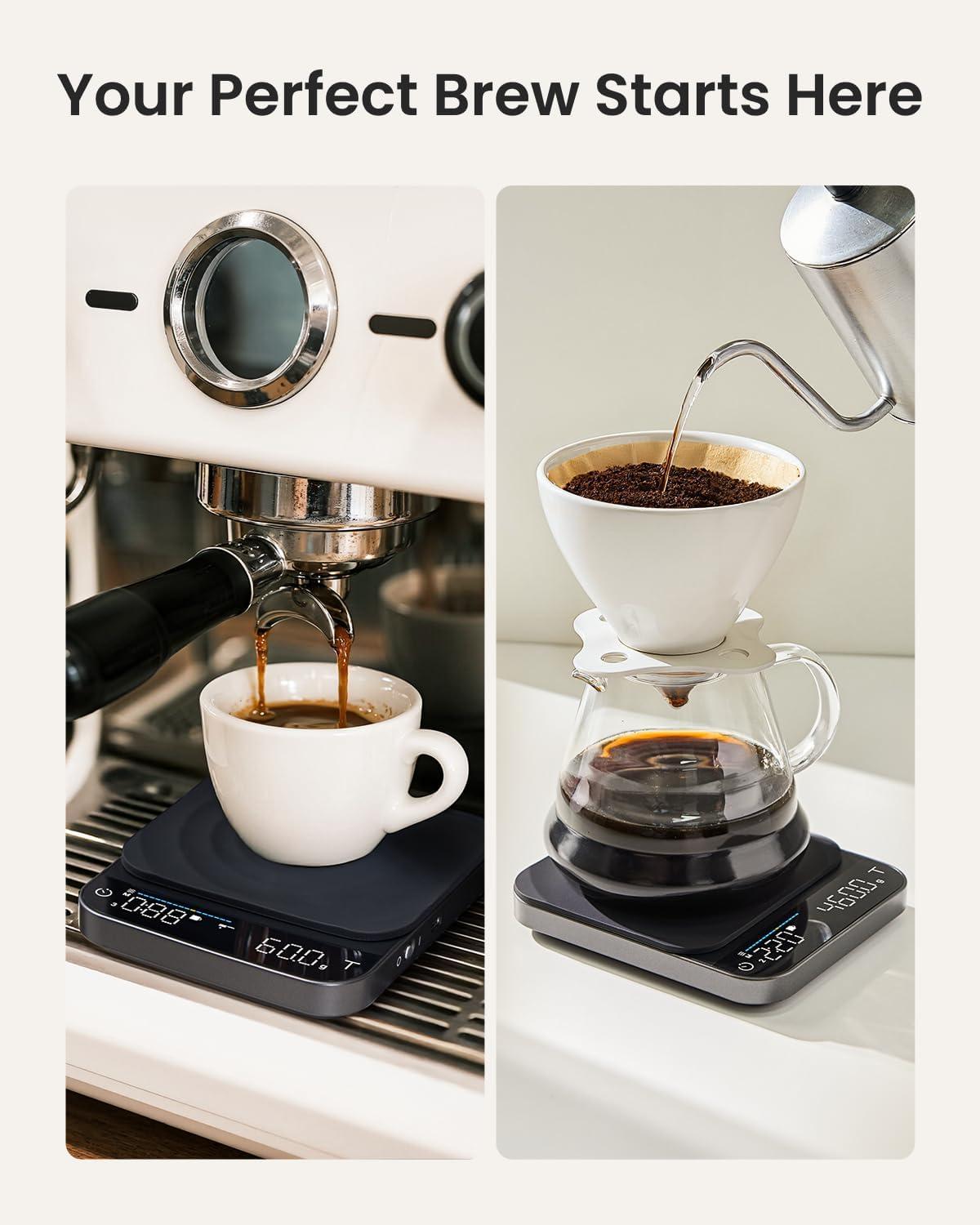 Versatile Coffee Modes: Choosing from 3 coffee modes—Basic Mode, Pour-Over Mode, and Espresso Mode(with auto timer), this small coffee scale caters to all your coffee brewing needs, from novice to expert. Perfect gifts for coffee lovers.