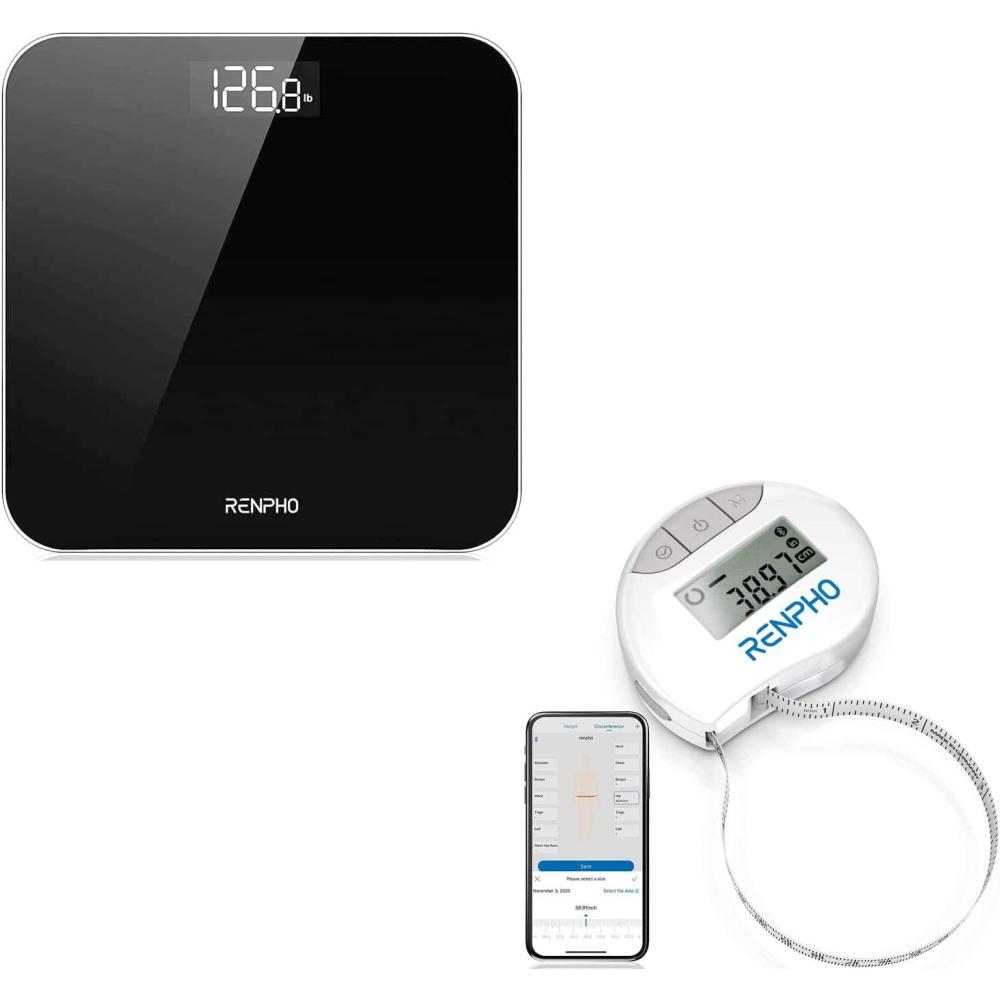 RENPHO Digital Bathroom Scale, Highly Accurate Body Weight Scale with Lighted LED Display, Round Corner Design, 400 lb, Black Smart Tape Measure Body with App – RENPHO Bluetooth Measuring Tapes for Body Measuring, Weight Loss, Muscle Gain, Fitness Bodybuilding, Retractable, Measures Body Part Circumferences, Inches & cm