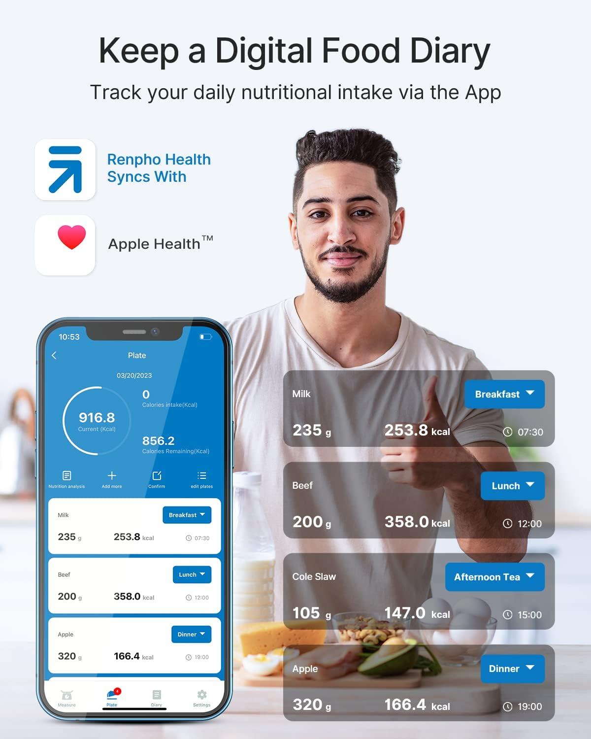 Works with multi-functional app: Easily operate the smart food scale through 'Gennec' / 'Renpho Health' app to monitor nutritional intake, calculate calorie, and store nutritional diary. The app provides access to tens of thousands of food items with nutrition facts, including calories, vitamins, and proteins, and you can also add and customize your own food data as needed.
