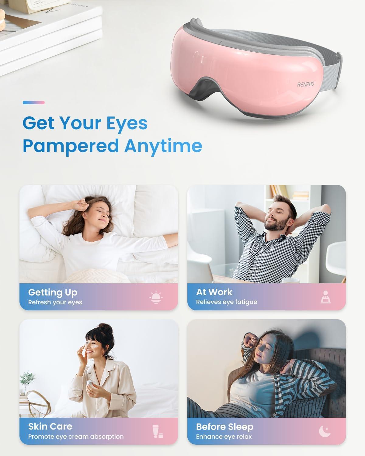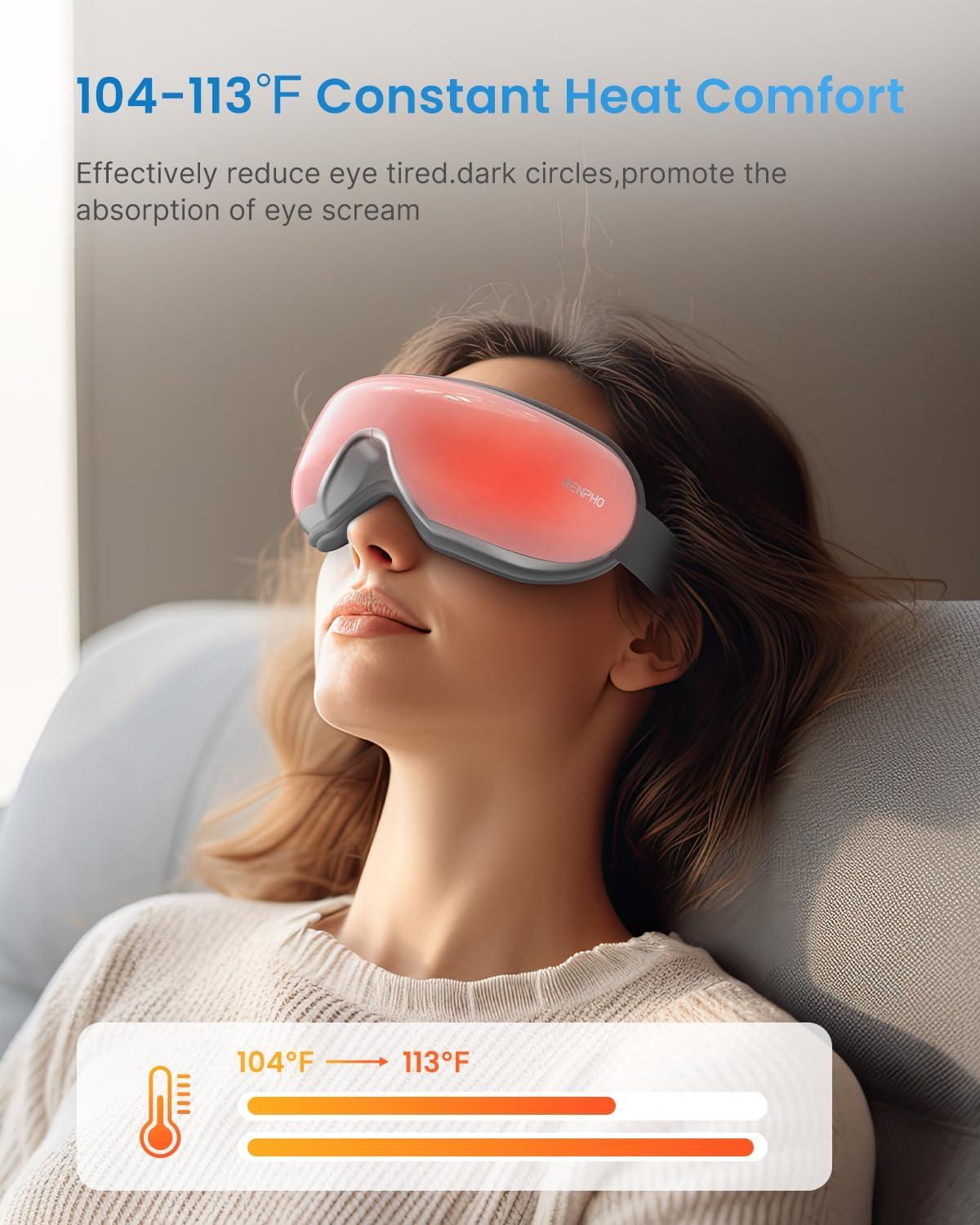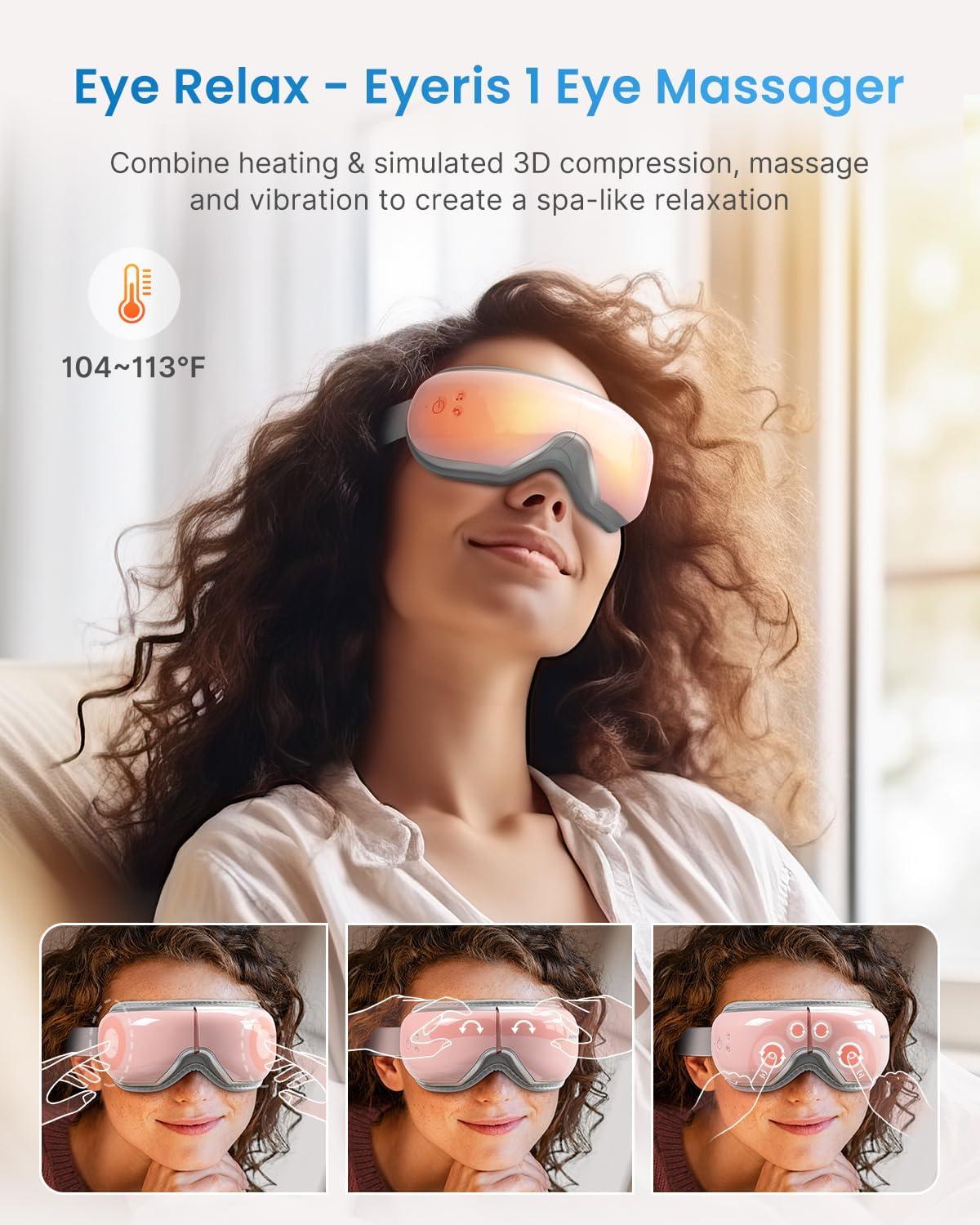 eye massager for soothing: eyeris eye massager equipped with constant heat, gentle vibration, compression and relaxing music, this eye massager for migraines boasts 5 massage modes that envelope your eye and temple areas, providing effective relief for dry eyes, eye strain, dark circles, eye fatigue, migraines and insomnia and improving overall eye health.