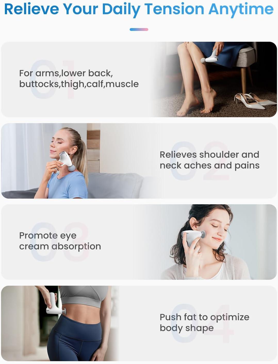 massage gun for relief: choose from 3 heat options to suit your comfort, including muscle relief and relaxation. The mini massage gun deep tissue comes with 2 interchangeable massage heads and 3 speed levels that can be switched to target specific muscle groups for a more personalized and effective massage session.