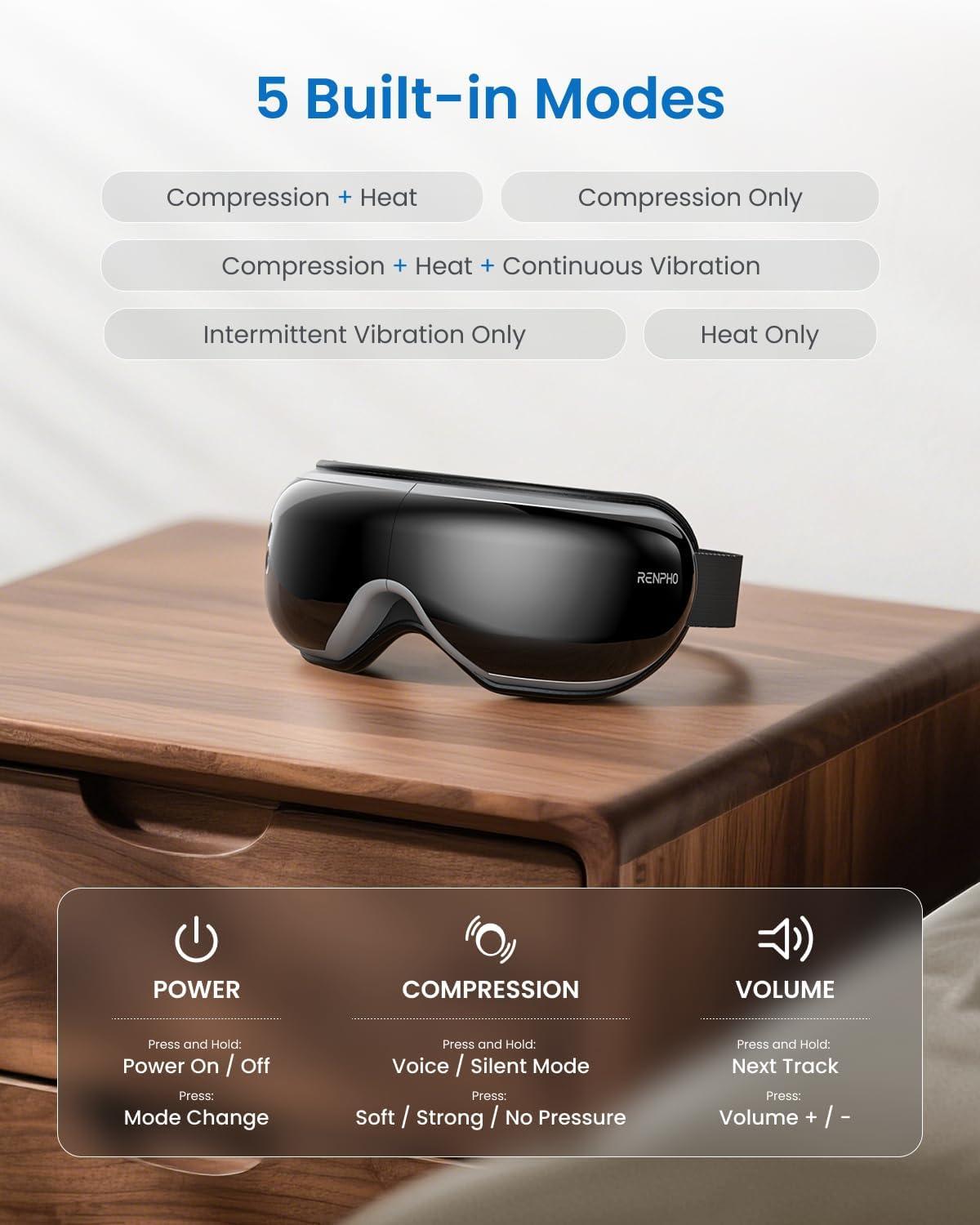 Comfortable Heating Massage – Renpho's eye massager built-in heating pads provide a comfortable temperature between 104 and 107 degrees Fahrenheit(40℃-42℃), better for relaxing eye puffiness, dry eyes, etc. A hot compress can regulate the metabolism of the eyes, more effectively improve symptoms such as dry eyes, and reduce dark circles