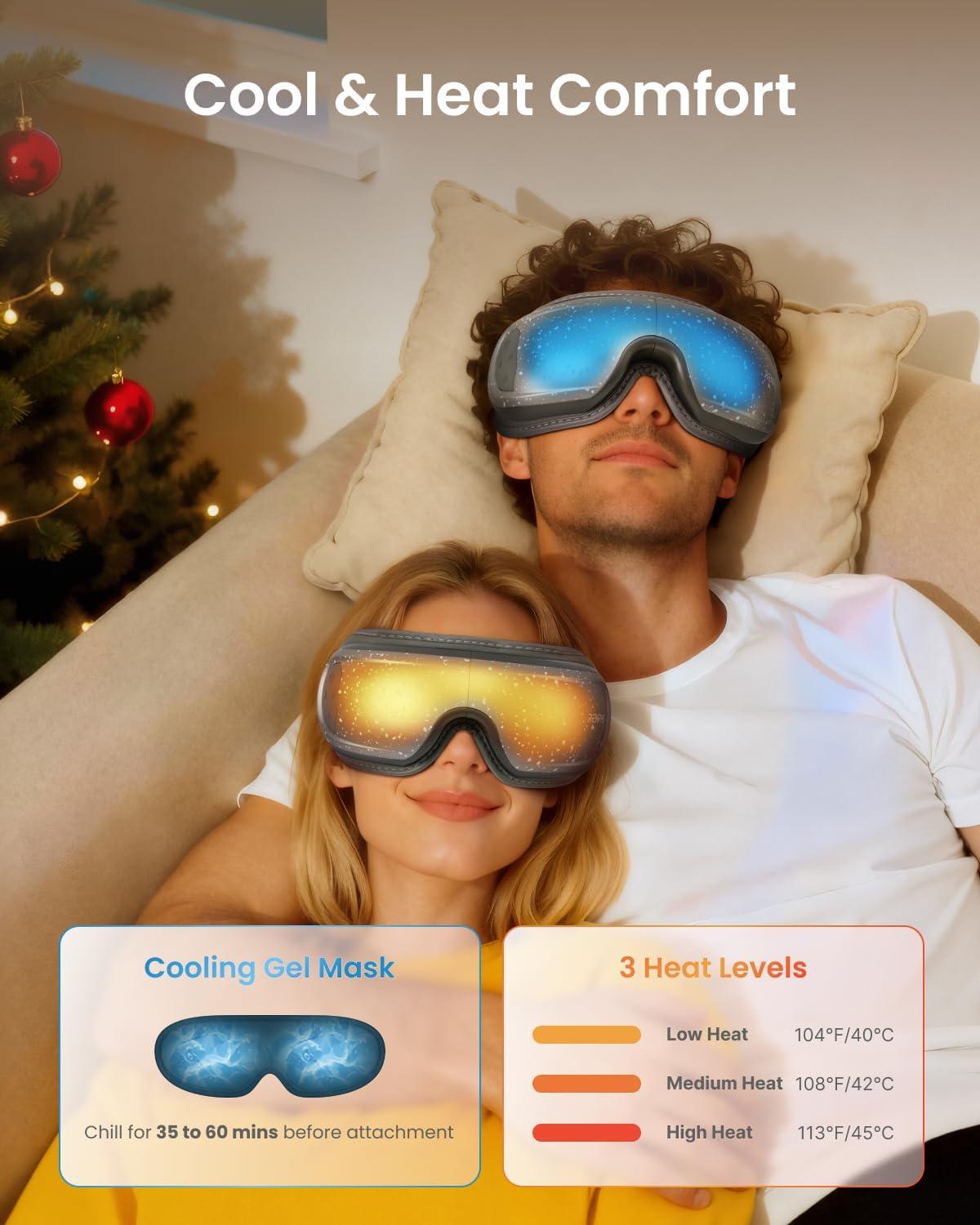 Soothing Heating & Cooling Compress: Enjoy 3 levels of variable heat from 104℉-113℉ (40-45 ℃) to relieve puffiness, dry eyes, and more. The removable cooling gel mask gifts can be placed in the freezer for 35-60 minutes and attached to the Eyeris 3 to provide a cooling compress that gently relieves eye strain and fatigue. Get a personalized fit with extended massage pads and an adjustable headband that fits most people