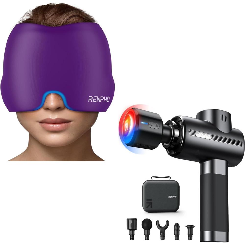 Upgraded Odorless Ice Head Wrap, Renpho Headache Relief Hat with Hot or Cold Therapy, FSA or HSA Migraine Ice Pack, Compress Face Mask, Gel Cold Relief Cap, Gift for Reduce Migraine, Sinus, Stress & RENPHO Thermacool Massage Gun Deep Tissue with Heat and Cold Head, Handheld Muscle Massager Gun with Carry Case, Body Masajeador for Men Women Neck and Back, Active Heat, FSA HSA Eligible