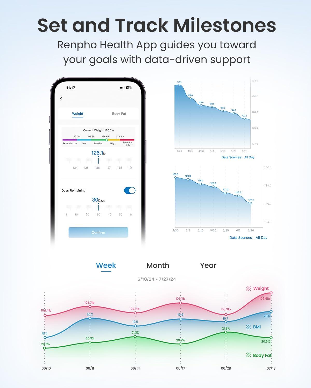 500lb Higher Capacity & Larger Platform: The Renpho smart scale supports up to 500 pounds (225 kg) with increments of 0.05 kg (0.2 lb). Its larger platform, measuring 11.8 x 11.8 x 0.9 inches (300 x 300 x 24 mm). The digital scale for body weight offers stability and comfort for a wide range of body types.