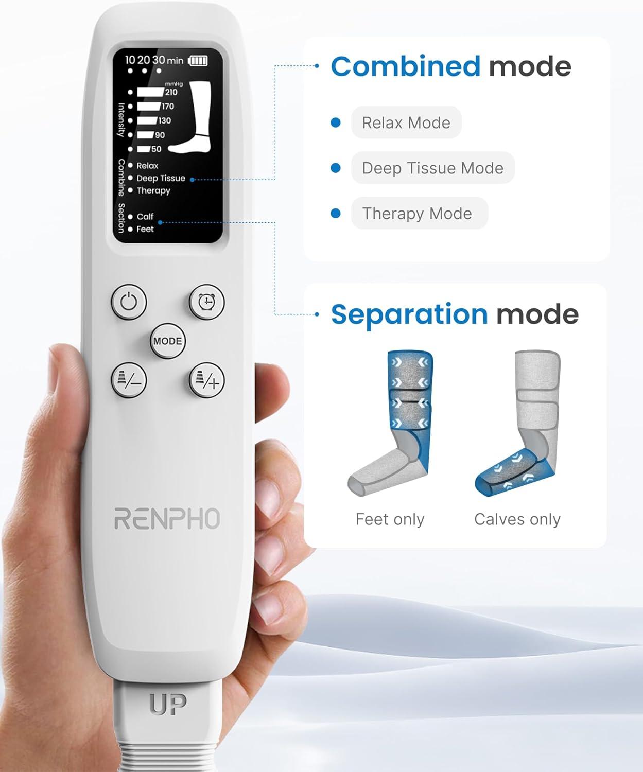 Customizable Settings: With 25 combinations (5 massage modes and 5 intensity levels) of inflation and deflation, this air compression leg massager effectively alleviates fatigue and speeds muscle recovery post-workout.