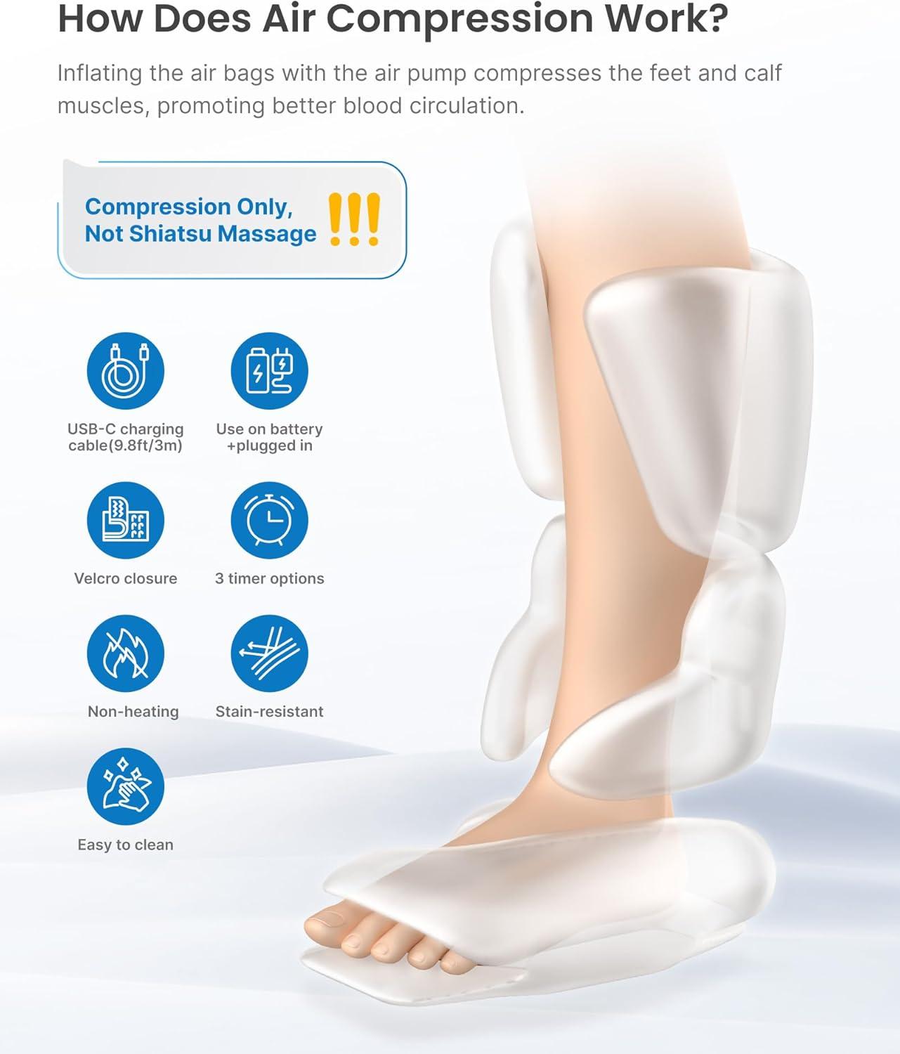 Optimized Relief: This calf massager boosts smart pressure sensors that automatically adjust pressure levels, ensuring safe and precise relaxation. The controller's display visually guides you through massage selections.