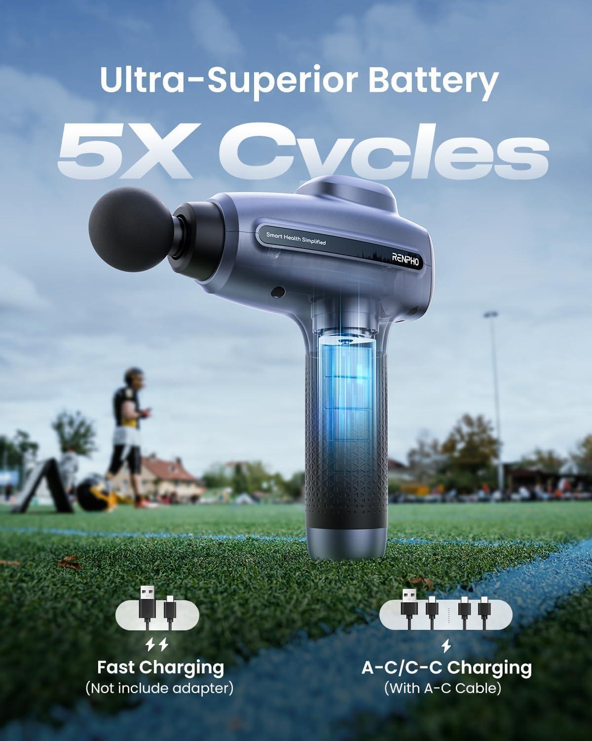 Fast Charging & Type C Charging:RENPHO Massage Gun quickly recharges, providing uninterrupted relief whenever you need it. It is powered by a long-lasting rechargeable battery and supports USB A-C or C-C cable (C-C cable not included).