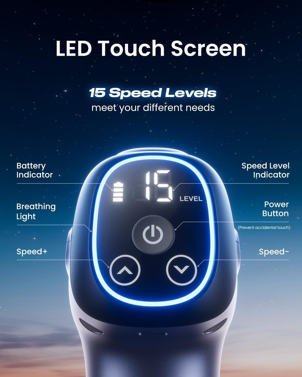 Ultra-long Battery Life & Smart LED Touchscreen: Our muscle massage gun offers an impressive battery life of up to 10,000 hours.The HD LED touchscreen allows you to easily monitor speed levels and remaining battery power at any time.