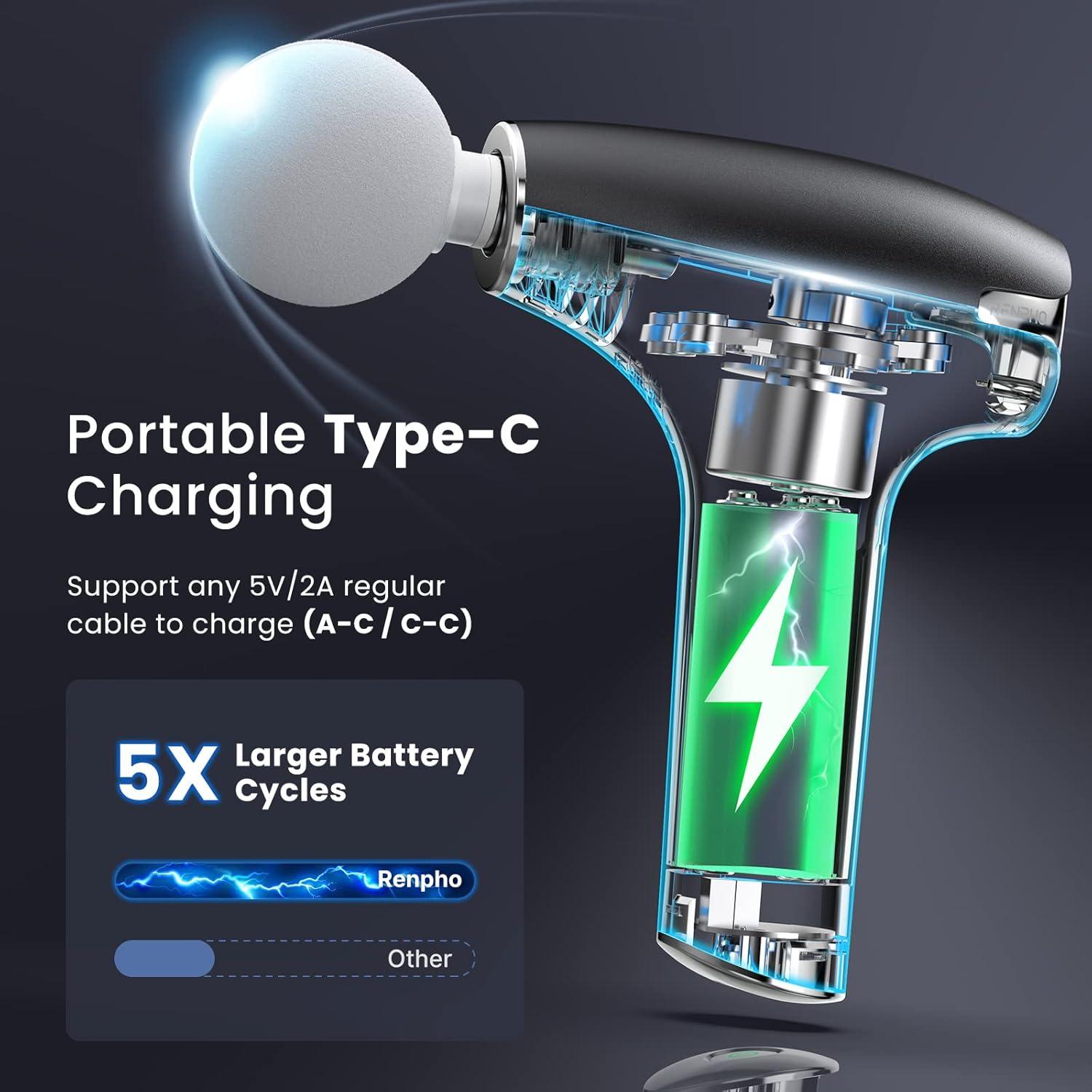 RENPHO Heated Mini Massage Gun–Type-C Charging & Long Battery Life: Renpho mini heated massage gun supports any 5V/2A A- C or C-C charging. You can charge this percussion gun massager with power back, car chargers, sockets and more. Equipped with a large capacity high-quality battery, can continue working for one week daily use fully charged (Tip: Use time may differ depending on the speed selected); Built with smart AI, it features a 10-minute auto-off to avoid harm from overuse to the human b