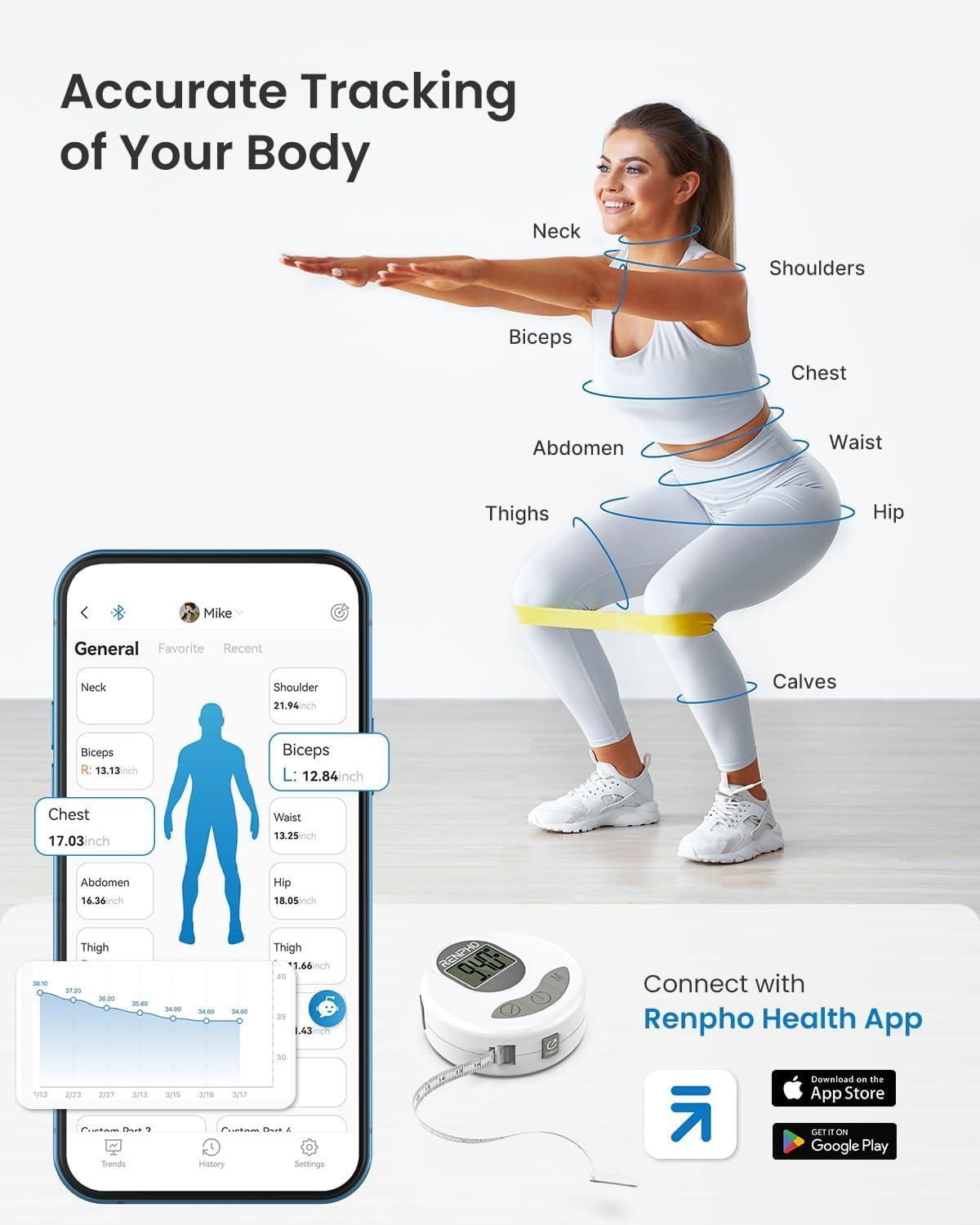 Works with Health Apps: Compatible with RENPHO Health app and Apple Health. Allows you to track the changes in your body circumference and customize your body part measurements.