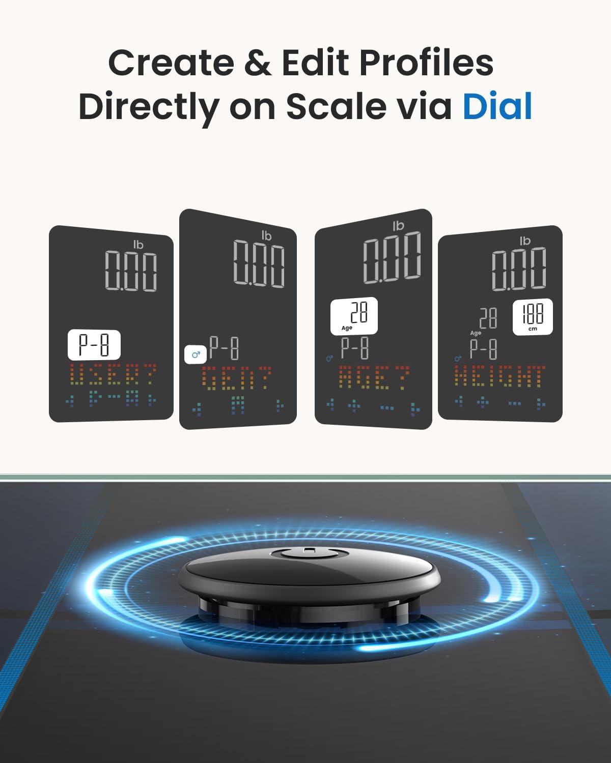 One Dial Control: Take control without needing a smartphone. This advanced scale for body weight allows you to create user profiles directly on the scale using the dial—simply twist and press for a streamlined experience.