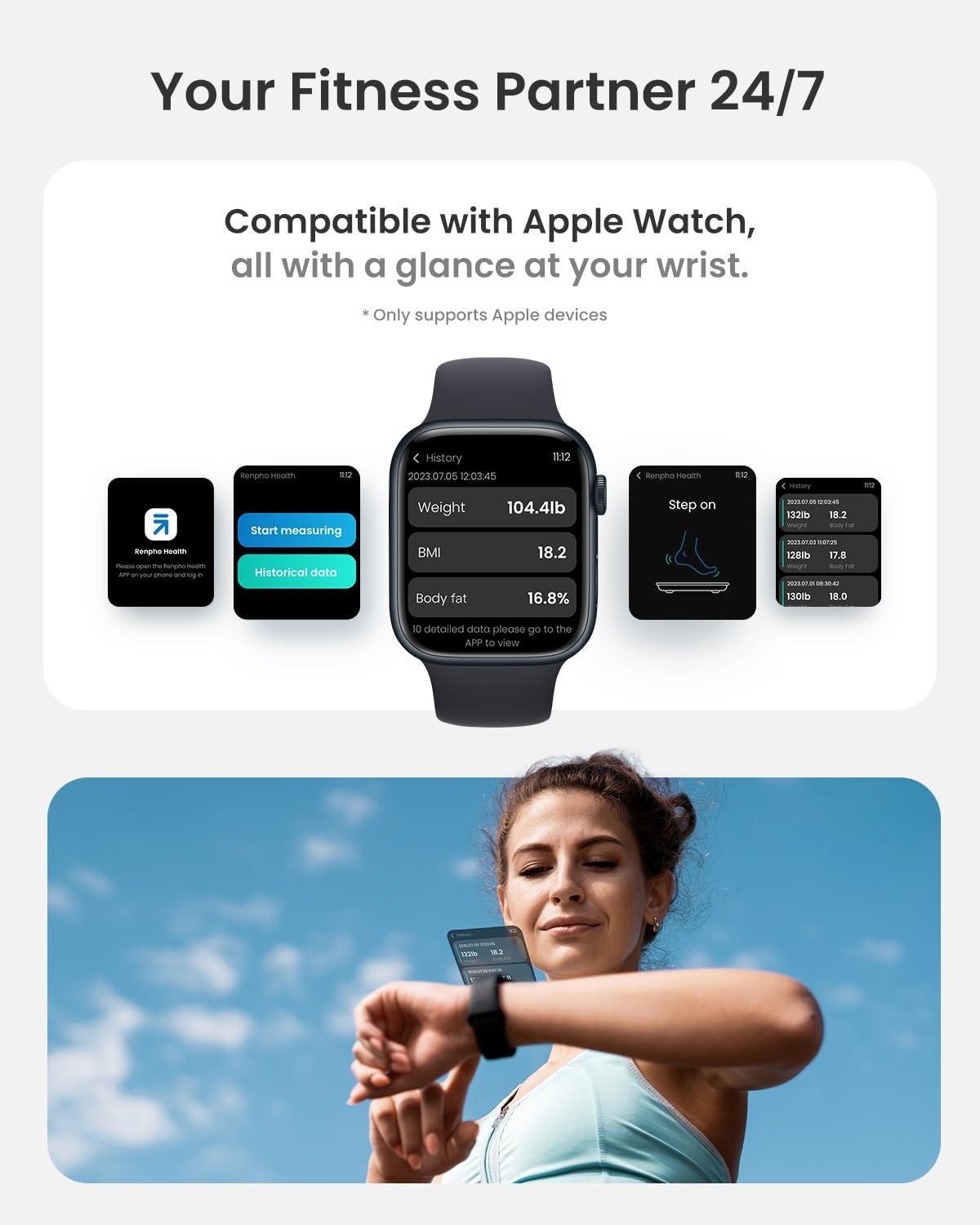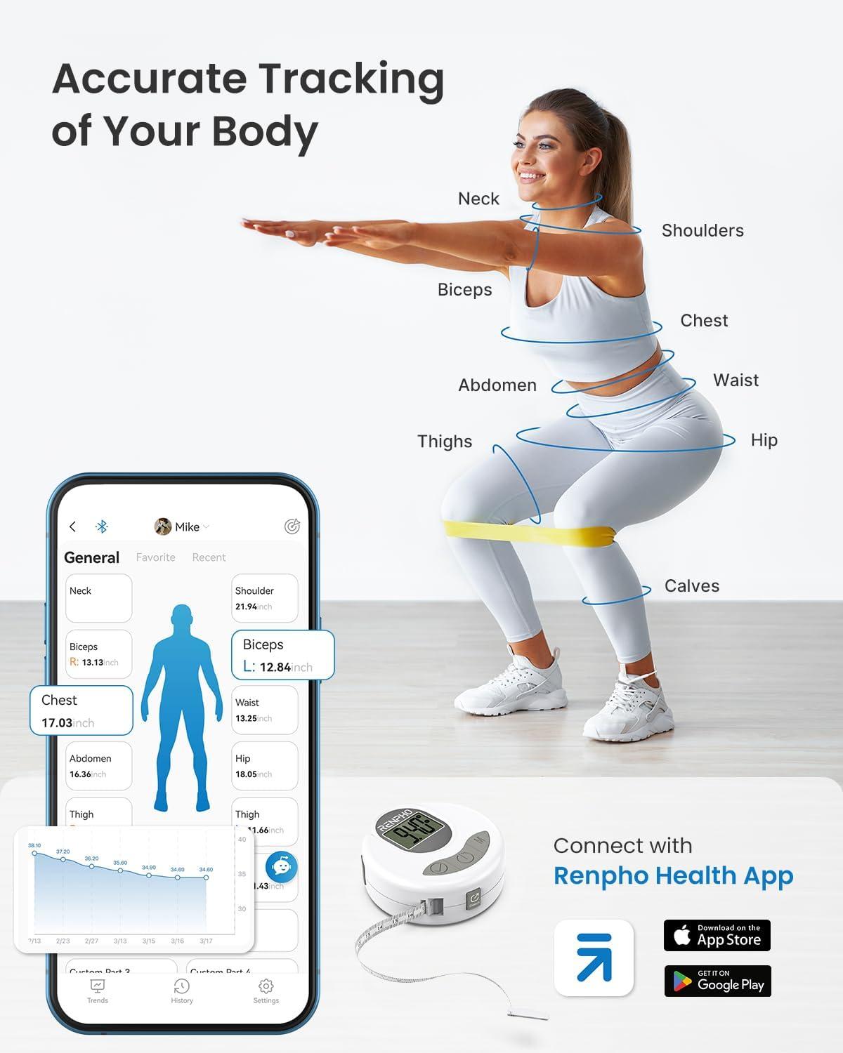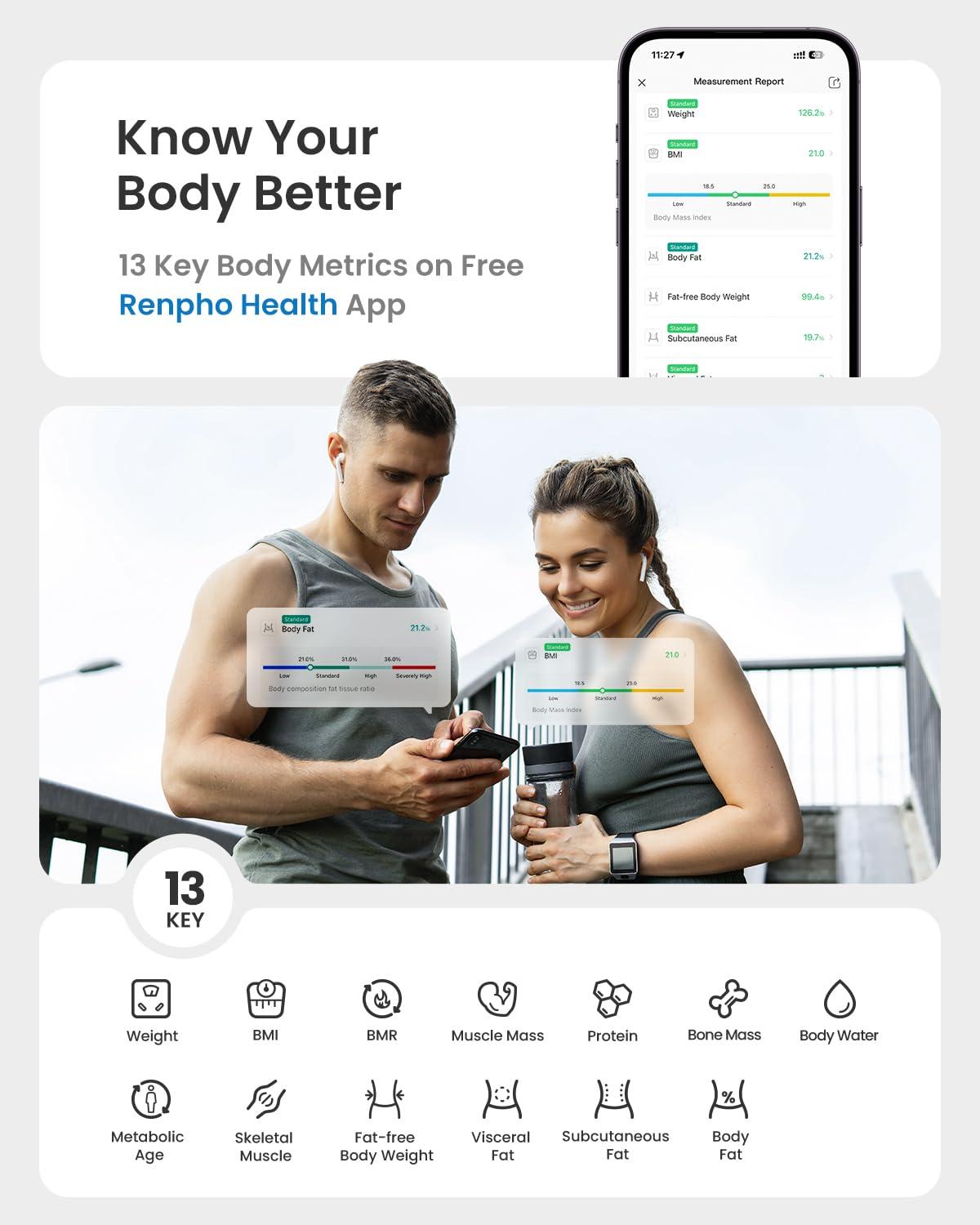 Detailed Body Analysis: Expand your health tracking by connecting this smart scale with the Renpho Health App, where you can analyze 13 detailed body metrics, observe long-term body trends, and set customized weight or body fat goals for a seamlessly integrated health management experience.