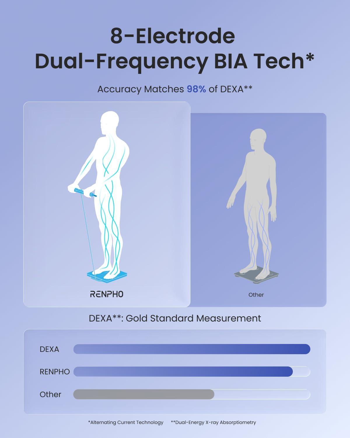 Highly Accurate Measurement: Equipped with eight-electrode dual-frequency and segmental BIA technology, the RENPHO MorphoScan Nova smart scale delivers a precise health overview, with a correlation to DEXA data of ≥0.98