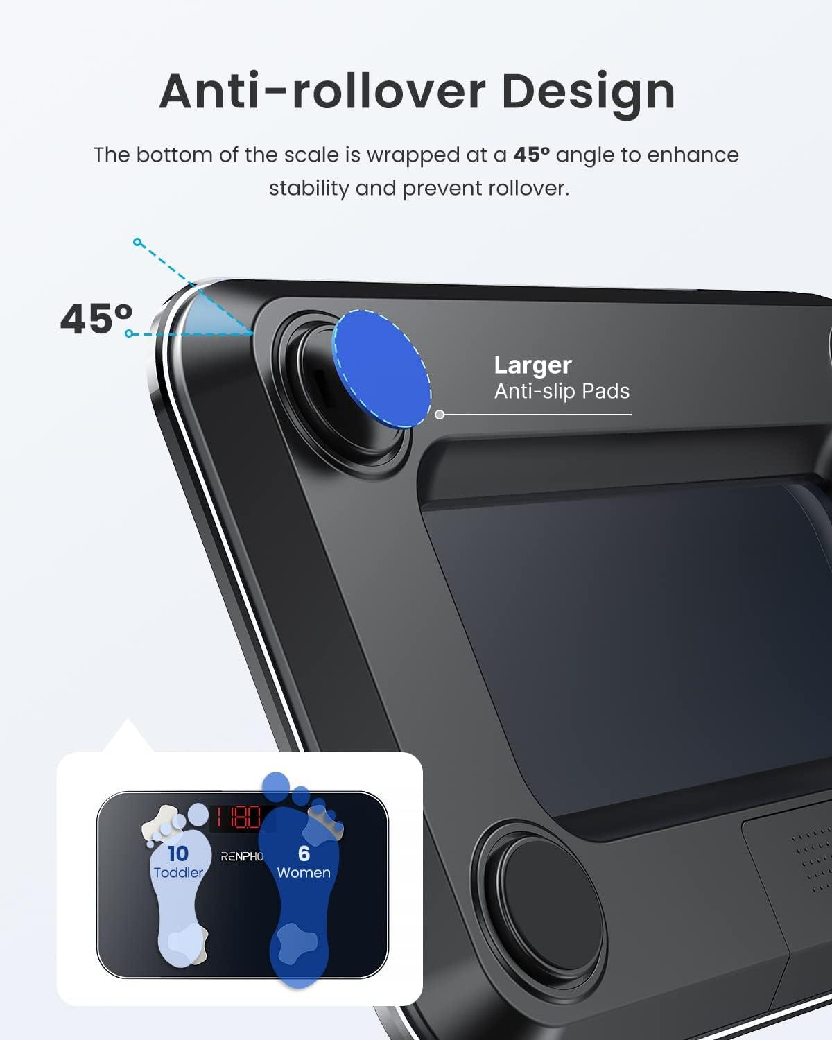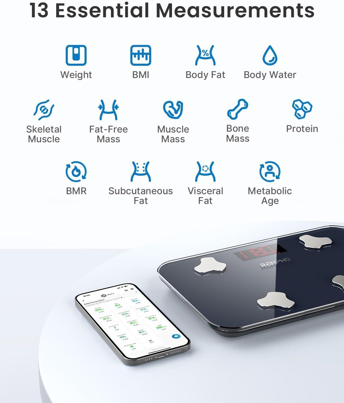 Travel Scale: 13 Key Health Metrics: Renpho Health app features 13 essential body composition evaluation that calculates your BMI and monitors changes in muscles, body fat, water, bones, and more. Our premium Bluetooth Digital Bathroom Scale gives you a full picture of your body.