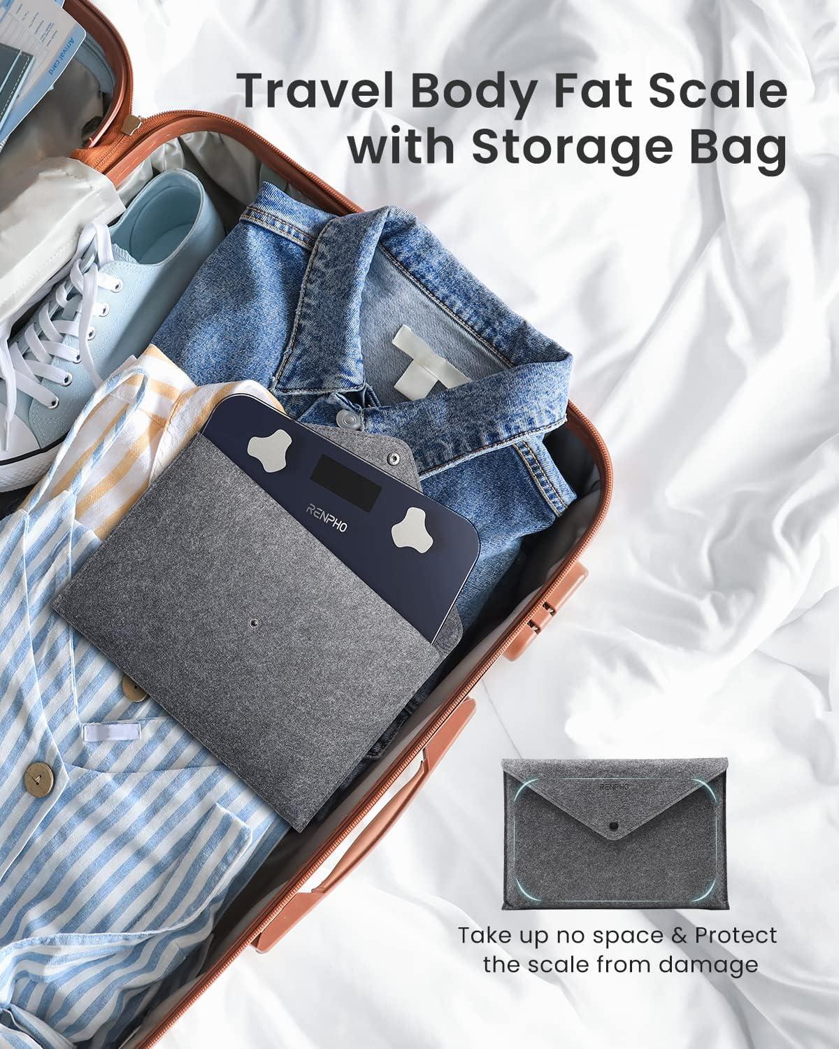 Travel Scale: Convenient & Portable Design: The size of the portable body fat scale is 11.02″ x 7.09″ and also comes with a storage case to protect bluetooth scale from dust and scratches. The bottom of the scale is wrapped at a 45° angle to enhance stability and prevent rollover. This scale can be easily packed into a backpack, suitcase or RV for traveling, and can also be used for on-the-go weighing in hotel and camping.